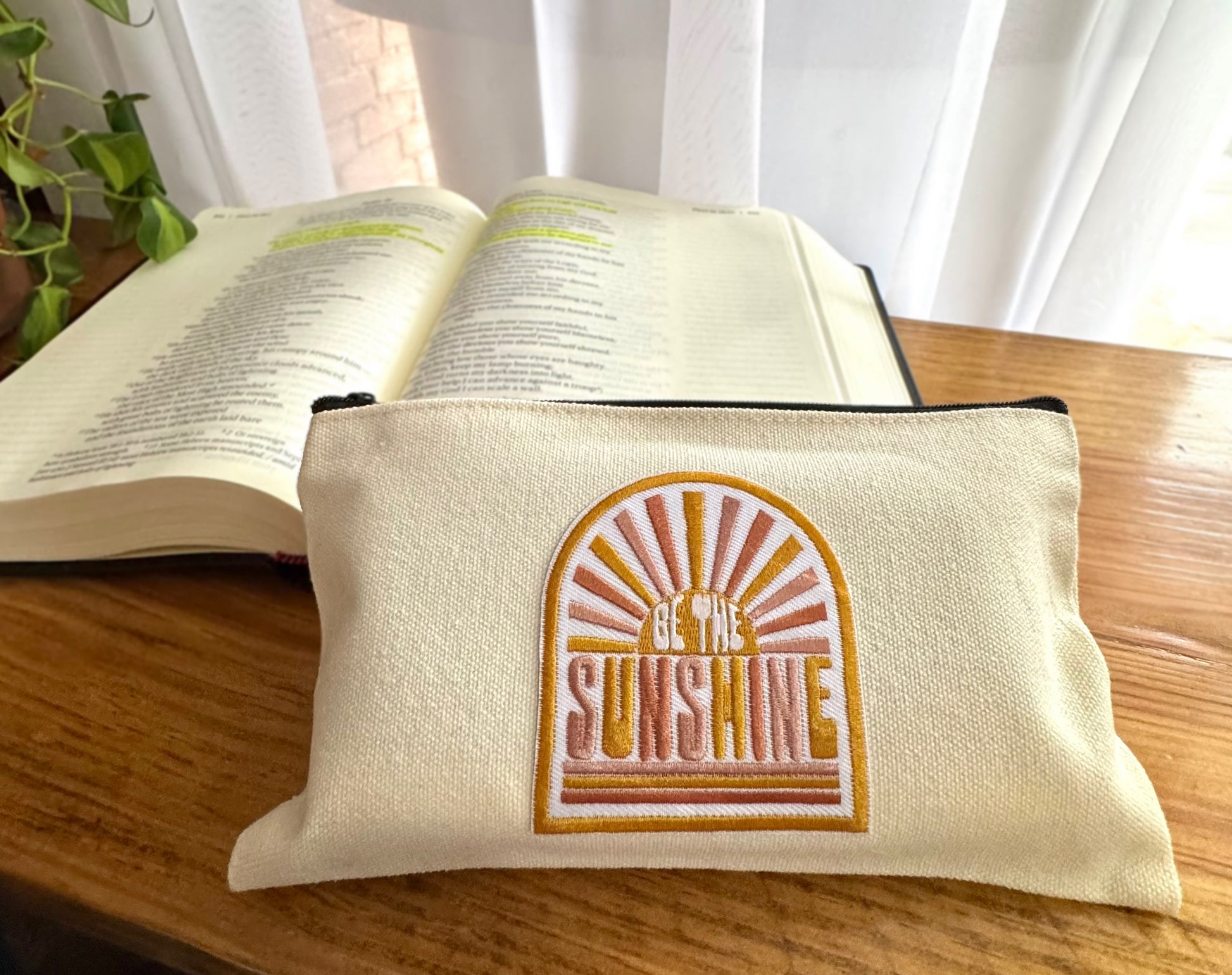 Carry inspiration everywhere you go. For the person who’s trying to stay organized… and sanctified. These beige canvas zipper pouches feature embroidered faith patches that remind you to slow down, smile, and stay grounded. Perfect for pens, makeup, tech cords — or whatever else life throws your way.